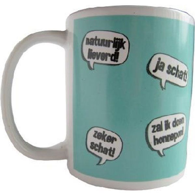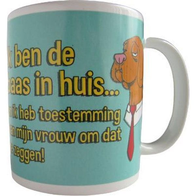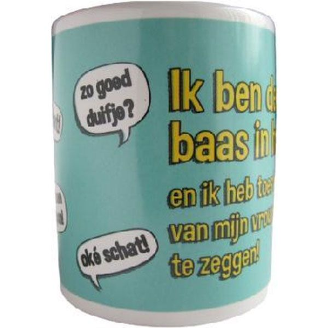 Grappige beker met een hond en de tekst Ik ben de baas in huis...en ik heb toestemming van mijn vrouw om dat te zeggen! Deze beker met leuke tekstballonnetjes met: zo goed duifje? Ja schat! zal ik doen honnepon! Oke schat! natuurlijk lieverd! zeker schat! is voor iedereen die van koffie houdt en een gevoel voor humor heeft. Een geweldig cadeau voor collega's, familie en vrienden! Deze beker is geschikt voor de magnetron en vaatwasser. Leverbaar in de kleur groen.