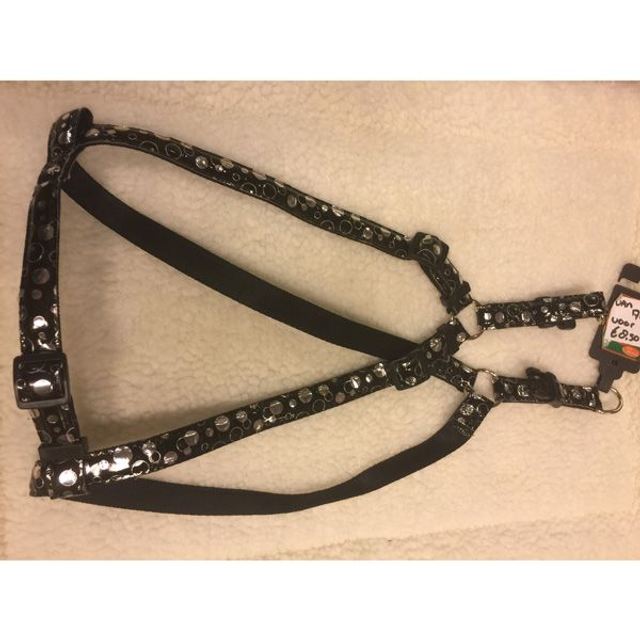Dog fashion harnas/tuigje met bubble print geschikt voor middelgrote tot grote honden gemaakt van nylon en PU. Dit verstelbare tuig is gemakkelijk aan en uit te trekken en biedt een hoog draagcomfort voor uw hond. Leverbaar in de kleur zwart/zilver.