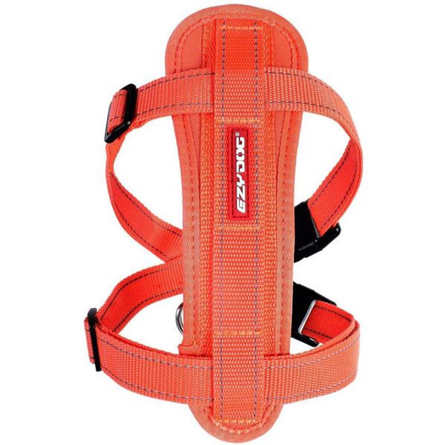 Ezydog borsttuig/harnas gemaakt van stevig nylon en heeft een gestoffeerde borst plaat die naar de hond vormt. Het verstelbare, stevige en ergonomische harnas is de beste keuze voor je hond. Dit harnas verdeelt de lading evenwichtig over borst van de hond in plaats van om de nek, waardoor wandelen plezieriger wordt voor jou en je hond omdat je veel meer controle hebt over je hond. Dit borsttuig is meer dan een hondentuig voor honden die trekken aan hun hondenriem. Dit harnas schuurt niet dankzij de gemakkelijk verstelbare riemen. Voor een ultieme controle over je hond is deze borsttuig te gebruiken met de schokabsorberende hondenriemen van EzyDog. Met een simpele kliksluiting is het hondentuig gemakkelijk om te doen is, waardoor je hond snel het huis uit kan om te spelen! Eenvoud, comfort en veiligheid in 1. Incl. gratis autogordel. Leverbaar in de kleur oranje, in maat 2XL.