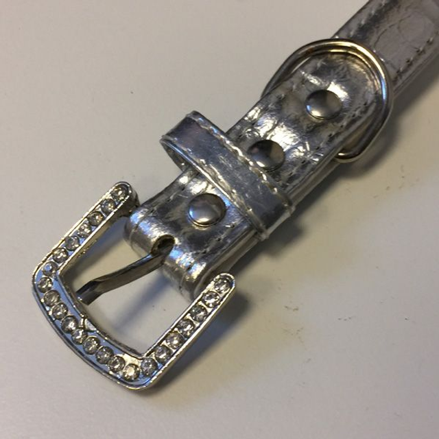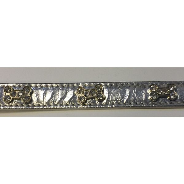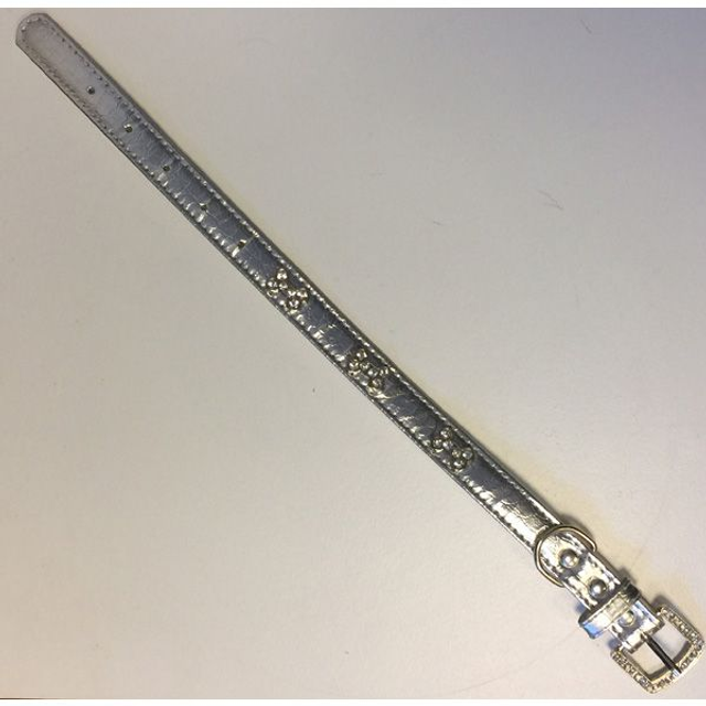 Halsband gemaakt van kunstleder afgewerkt met strass botjes. Deze halsband is geschikt voor kleine en middelgrote honden. Leverbaar in de kleur zilver, in de maat XS/S.
