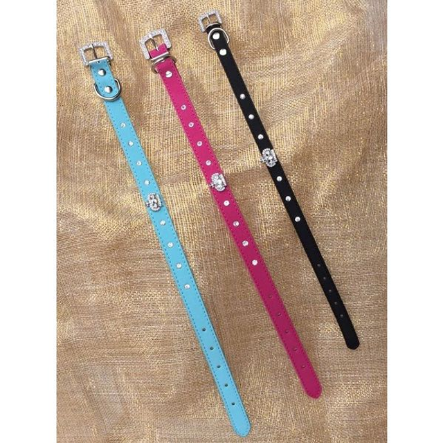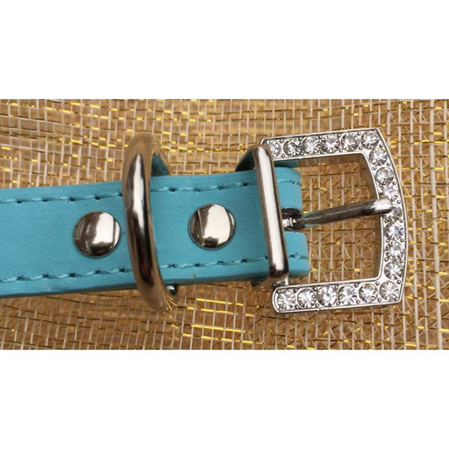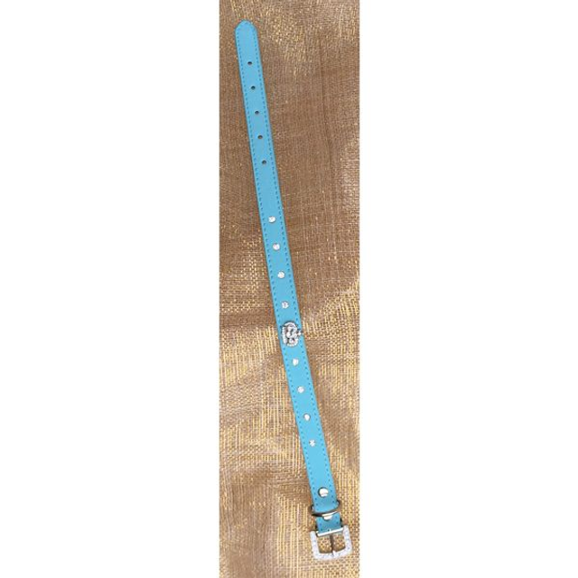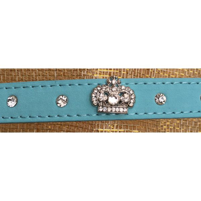 Halsband gemaakt van kunstleder afgewerkt met strass kroontjes. Deze halsband is geschikt voor kleine en middelgrote honden. Leverbaar in de kleur licht blauw, in de maat S.