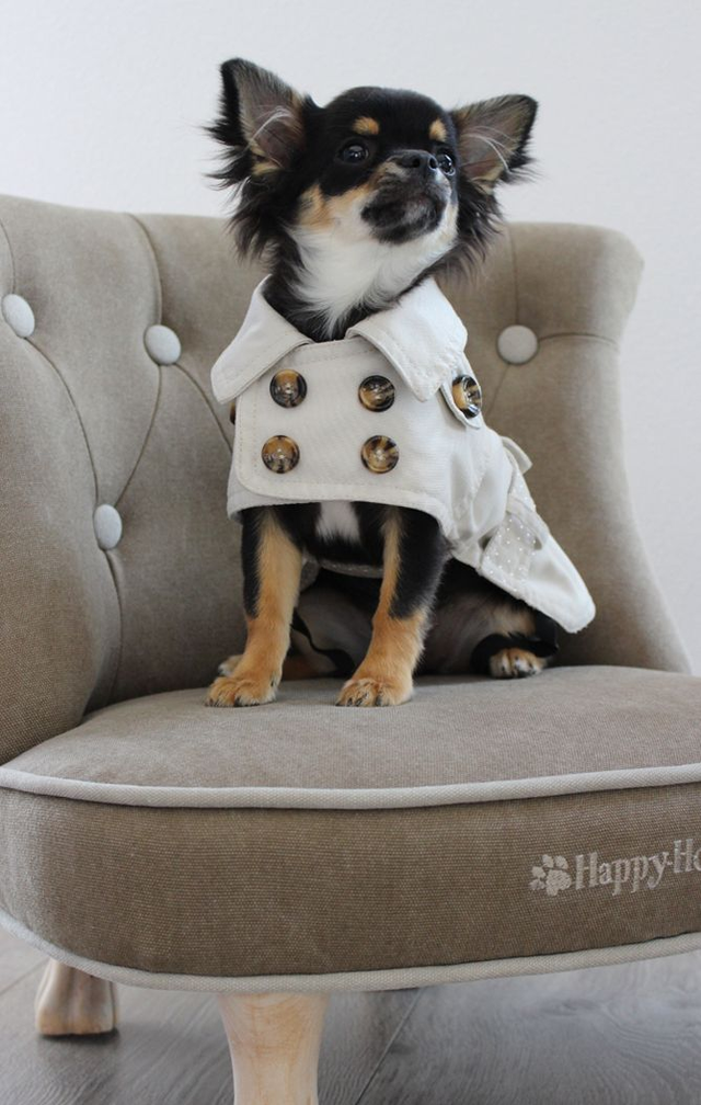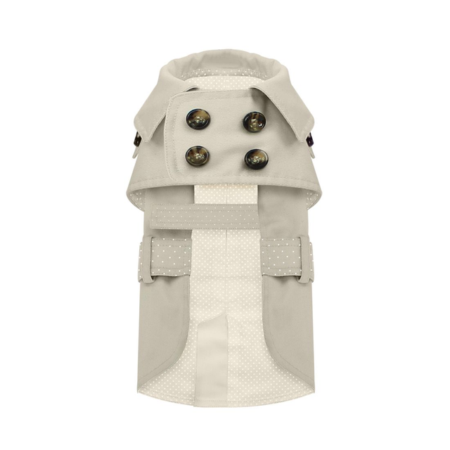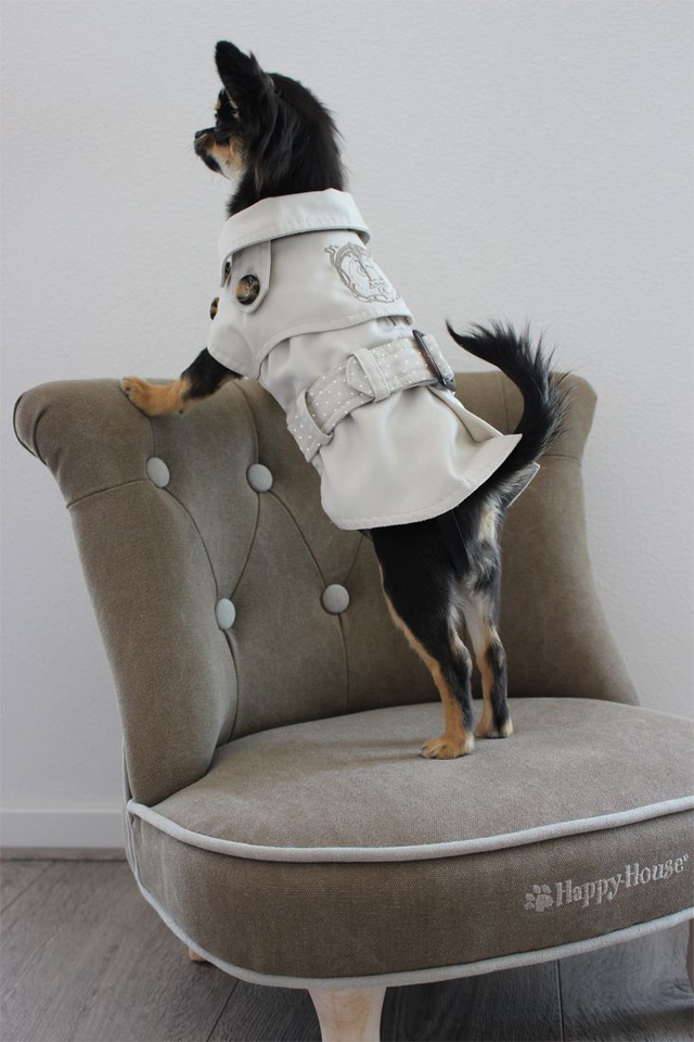 Met de Happy House Lovely Dots trenchcoat loopt jouw hond er zeker fashionable bij! Deze jas voorzien van gestippelde accenten in de voering en op de rug is gemaakt van waterafstotende stoere stof. De gesp, knopen en het luxe borduursel maken dit tot een super leuk hondenjasje! Deze jas is te gebruiken met een halsband of een harnas/tuigje d.m.v. de rits aan de bovenzijde van de rug (onder de kraag). Leverbaar in de kleur beige, in maat 24.