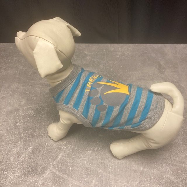 Hondenshirt gestreept met de tekst "Trendydog" geschikt voor kleine honden. Leverbaar in de kleur grijs/blauw.