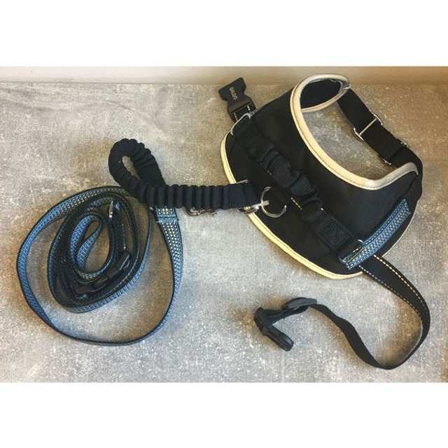 Neem uw hond mee uit joggen of wandelen! Dit hondenharnas voorzien van handgreep met joggingriem van MeliTec zijn beide gemaakt van stevig nylon en zijn voorzien van reflectiestrepen zodat de hond vanaf ver zichtbaar is in het donker. Leverbaar in de kleur zwart/grijs/blauw, in de maat S.